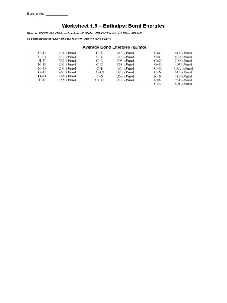 In other words, enthalpy is a state function. Table 1 average bond energies (kj/mol). Bond enthalpy worksheet name _ use bond enthalpy values to . Bond energy calculations worksheet for low/mid ability year 10. Bond energy worksheet expert use the table below to solve the following exercises.
